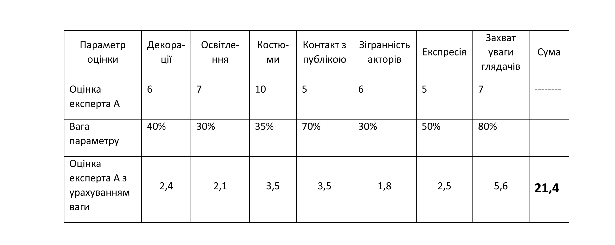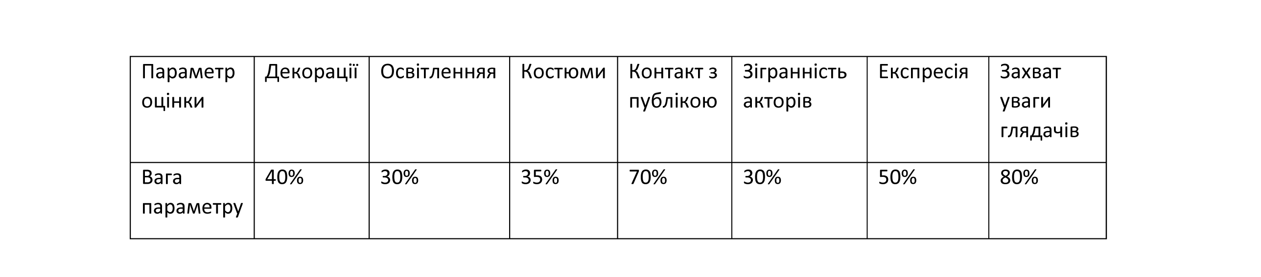 10-бальній шкалі), вага важливості декорацій у виставі , наприклад - 40%.